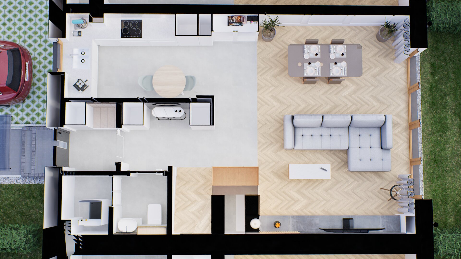 pokój dzienny, kuchnia, trzy pokoje, dwie łazienki, garderoba.